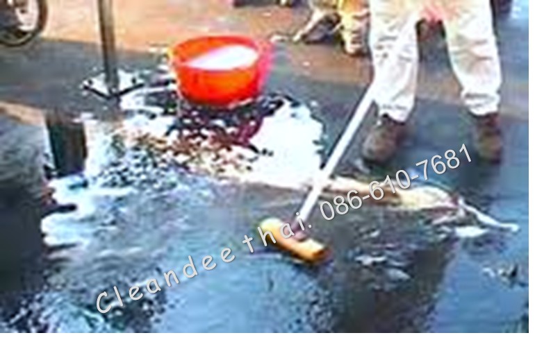 ทำความสะอาดบนพื้นโดยใช้ม็อบจุ่มน้ำยาแล้วถูบนพื้นผิวที่มีคราบน้ำมัน จากน้ำสามารถกวาดน้ำออก